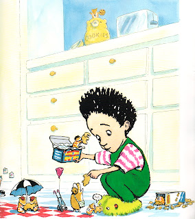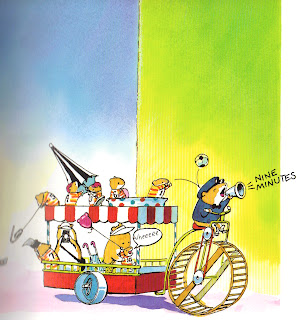 I think I was conditioned to love a picture book that has a plethora of infinite details in every page spread by the abundance of Richard Scarry book in my childhood home (I WILL find you on every page one of these days, Goldbug!!) Perhaps this is why I am so fond of Peggy Rathmann's magnificent book first published in 1998 (it is available in paperback AND lap book, which is the oversized board book format) 10 Minutes till Bedtime. The only text in the book is a father counting down each minute to bedtime as a child - boy? girl? we never really decided in my home - basically sets up the equivalent of a hamster amusement park while also completing bedtime tasks like bathing, brushing teeth, peeing and getting on jammies.