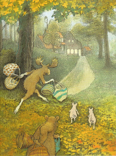 Moose heads over to an old-fashioned telephone situated on a tree (insulators conveniently placed on a branch above) and rings up the Beavers to ask for their help. The team of Beaver Builders arrive and say that they wish "to be paid in peanut-butter sandwiches. No one had any objection." The building of the house takes up eight wonderful pages and includes my favorite passage in the book,By lunchtime the walls of the house were up . . . and by dinnertime the roof was on. (The lunch and dinner times were on different days, of course. Beavers are fast, but not that fast."