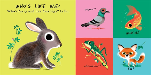 With thick, glossy pages somewhere between a board book and a paperback, What Will I Be? and Who's Like Me? have flaps! More than just a book about what animals hatch from eggs and cocoons and what babies grow into which adults, What Will I Be? and Who's Like Me? encourage readers to think and engage with the books beyond merely looking under a flap. Marc Boutavant's bright, big eyed animals are perfectly matched to Davies' words. A bit cartoonish and very cute, Boutavant's animals are sure to grab the attention of even the littlest listener. Boutavant also illustrated Mary Ann Hoberman's last book of poetry, All Kinds of Families and wrote and illustrated his own seek-and-find, Around the World with Mouk.