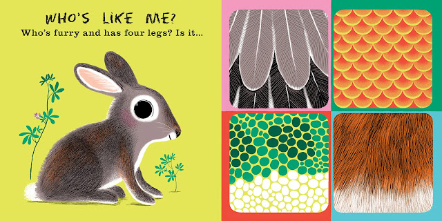 Who's Like Me? does more than ask "who's furry and has four legs?" The book introduces concepts like breathing air and breathing water and terms like mammal, amphibian and reptile. In Who's Like Me? every other page has four flaps for readers to peek under. The final page shows images of all twenty animals introduced in the book and asks, "Who belongs together? Who's like who? Use the colors to give you a clue!" The animals are grouped by the background colors and, just in case mom and dad can't figure it out, there are answers along the border. The final flap of the book asks, "What group do YOU belong to? Who's like you?" Beneath the flap is a little girl and the text reads, "Rabbit, elephant, beaver, fox, bat, and kangaroo - they're all like you! You're a MAMMAL, too!"