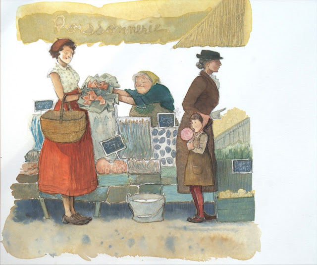 The magnificent Amy June Bates evokes the time and the place perfectly with her palette of earthy colors like ochre, cornflower blue and dark sea green that pop when she adds a burst of red here and there. She captures the architecture and culture of Paris in the 1950s and one of my favorite illustrations from the book is a cut-away dollhouse view of the Child's apartment with them doing something in every room, including Julia in her kitchen. For those of you who wonder if young listeners who do not give a hoot about gastronomy, Julia Child or Paris, Bates introduces the story with the character of an inquisitive little girl as well as an ever-present cat. By page twelve of Minette's Feast: The Delicious Story of Julia Child and Her Cat, the Childs have adopted a cat and the regal Minette takes over as the star of the show and the book becomes the story of a cat owner trying to fix the perfect dish for her picky pet.
