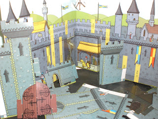 Above is a photo of the castle page with some of the punched-out pieces propped up and laying flat. Below is a view of the menu-like fold out instruction page that walks you through the process step-by-step. There is also an image of two "mini master class" tutorials. These are included with each scenario and, using techniques employed in the scenario, teach readers how to make something new and different using the skills they just learned, giving ideas for new projects.