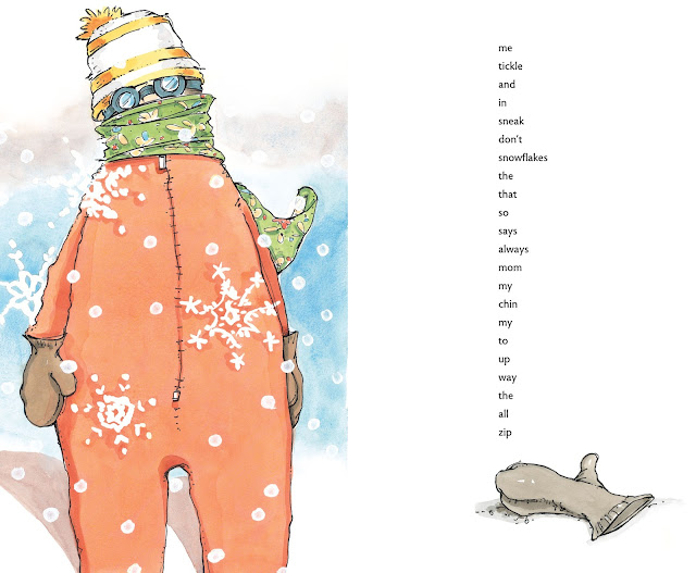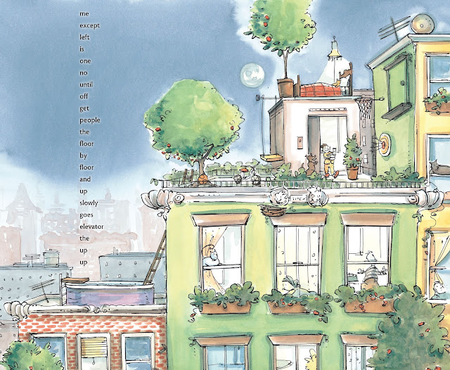 a meal of the stars : poems up and down by Dana Jensen with illustrations by Tricia Tusa is a unique book of poems. I am a huge fan of Tricia Tusa's art work and you can read a fantastic interview (from 2008) with her and see some of her work as well as her studio by visiting Seven Impossible Things Before Breakfast. Tusa's delightful illustrations add so much to the Jensen's playful poems, which are very visual themselves. As you might have guessed from the title, these untitled poems are meant to be read from the bottom up sometimes and from the top down others. Waterfalls, kites, ladders, elevators, giraffes, ferris wheels and balloons on strings are the subject matter here. They speak best for themselves, so enjoy these spreads from this wonderful book. These creative, fun poems will surely inspire readers to write and illustrate some up and down poems of their own!