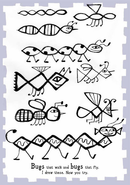 The introduction to Dragon, Robot, Gatorbunny begins, "Hello! Hello! Calef Brown here. May I tell you something? I love to draw! It's my favorites thing to do, anytime, anywhere. I sketch and doodle with pens, pencils, markers and brushes. I usually start with an outline, or a simple shape - a circle, a triangle, maybe a funky trapezoid. Then it's time for lots of lines - thing lines, thick lines, zigzags, loops. Eyes and noses. Ears and mouths, wings and paws. Whiskers. Fins. Wheels?" He goes on to encourage artists to "jump right in! Follow some of my drawings, if you'd like, combine them, or feel free to make up your own fantastical creations!" Brown starts his book with snails because, as he says on his website, "The book begins with what inspired it - the drawings of snails that I do when visiting schools, and seeing the excitement of kids, some as young as 4, as they create their own spin-off snails."