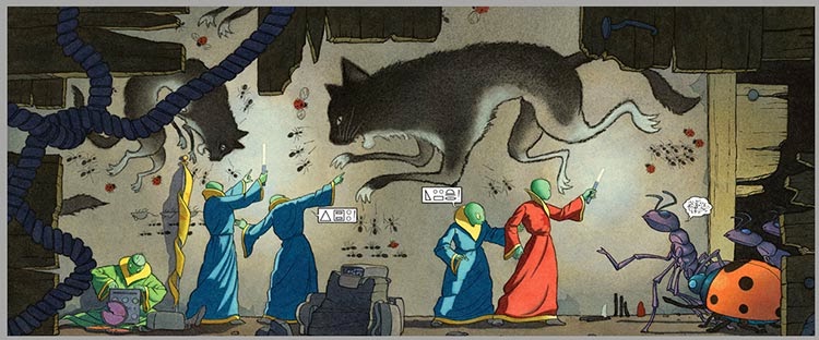 The aliens get some help from an a surprising corner where they also find some ancient art that that helps them repair their ship and dodge Mr. Wuffles.