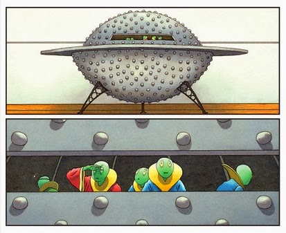 With his characteristic attention to detail, Wiesner creates a magical world that is grounded in reality, as he does with so many of his books. One moment you are on the floor with Mr. Wuffles as he bats his toy around, looking every bit the cat, then you are inside an alien spaceship and communicating in another language. One thing I especially love about Wiesner is that, if he is going to have aliens talking in one of his books, he is going to develop a language and consult a linguist who helps him to construct the alien speech. You can try to decode their language on their own or use the key that Wiesner provides on his website, below.