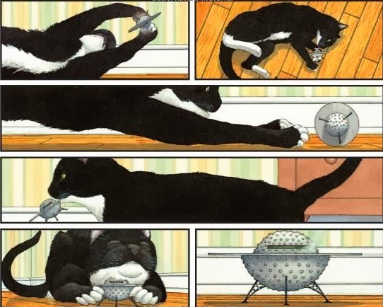Originally, Wiesner started his story with the aliens in a sandbox being discovered by a girl, but couldn't figure out what crisis of their story would be. Ten years later and a few more failed iterations of the story and, in 2011 a drawing of a spaceship in his sketchbook tied it all together for Wiesner. And the crisis is clear almost from the start of the story. Mr. Wuffles is a discerning cat who has lost all interest in his toys, which still have the price tags on them, if he ever had any to begin with. But, there's something about that new toy with all the bumps on it...
