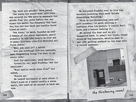 The rest of the "official report" is taken up with the plans the trio makes for their Christmas Day trek to the sewage plan to see the "poop fountain" gurgling for the last time. And they do have a realistically genuine adventure once they get there, along with serious descriptions of the smell (expressed in haiku) and a diagram describing what the plant does and how it actually works. What makes The QwickPick Papers: Poop Fountain! truly worth reading is the story that Angleberger weaves into the adventure, mostly as told to us by Lyle in his "unofficial personal notes" and the handwritten additions to his typed text. We learn how Lyle, Marilla and Dave became friends, a side note telling us that Lyle has a crush on Marilla. We also learn that Lyle is sensitive about how much money his parents spend on him, especially when his dad has one of his "big things" about how they will never pay off the credit cards and student loans from college, which he didn't finish. Lyle also talks about being friends with Dave, who comes from a family that is financially secure. Dave doesn't brag about having more money than Lyle and Marilla, it's more like he is completely unaware of what not having money means for Lyle and Marilla.