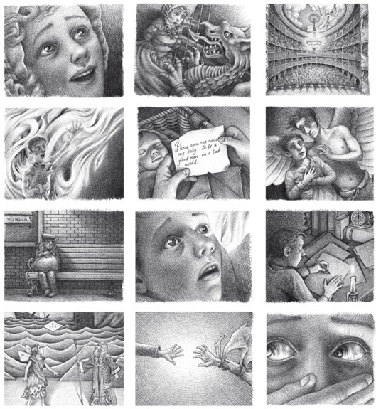 Set in 1766, the illustrations tell the story of a young stowaway, Billy, his dog Tar and his beloved older brother Marcus, at sea on an American whaling ship named the Kraken. They are performing a play for the crew when a storm strikes. Marcus does not survive, but Billy (and Tar) makes his way to London and finds himself taken in by the a construction crew, made up mostly of sailors, who are building a theater. After telling his story to the artist in residence, an image of Marcus, angel's wings on his back, is painted on the ceiling of the theater. The Royal Theater becomes Billy's home and Billy, who takes the last name Marvel, becomes a father when an infant is left at the backdoor of the theater. This redheaded boy, named after Billy's brother, goes on to marry and, with his wife, become theater royalty. Their son, becomes even more famous, in part for his wild, impetuous personality on and off stage. In turn, Alexander's son Oberon, named after Alexander's greatest role, marries and has a son he names Leontes, after his greatest part, playing King Lenotes in A Winter's Tale. Leontes, however, has no taste for the theater and is a disappointment to his parents. As the 1766 portion of The Marvels draws to a close, Leo discovers his grandfather living secretly in the bowels of the theater and also finds the courage to follow his heart and head out to sea. As he waits at the dock to set sail, he sees flames and smoke. The Royal is on fire. Leo rushes in to save his grandfather. Then the page goes blank.
