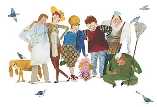 But, before Eddie can take that wonderful, fluffy little squishy home to her Mommy, she has to do some negotiating with Quentin, the garbage man. Fortunately, her friends in the village have given her just the things she needs to get that little fluffy squishy cleaned up and home to Mom - with the help of her WONDERFUL FRIENDS! The endpapers for The Wonderful Fluffy Little Squishy are fantastic - and slightly different. Below is the endpaper from the back of the book, where you see Eddie and all her wonderful friends along with the Fluffy on her head. At the start of the book, we see the friends and Eddie, minus the Fluffy. From cover to cover, The Wonderful Fluffy Little Squishy is . . . wonderful!