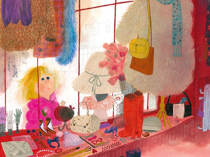 Because she lives in a charming little village, Eddie is able to run out the door, from shop to shop, looking for the perfect present for Mommy. First stop? Mr. John the baker, who, "with all his wonderful squishy things," surely will be able to help Eddie. Sadly, all he has is a warm brioche, fresh out of the oven. Eddie pops it in her pocket and head out to the next shop.