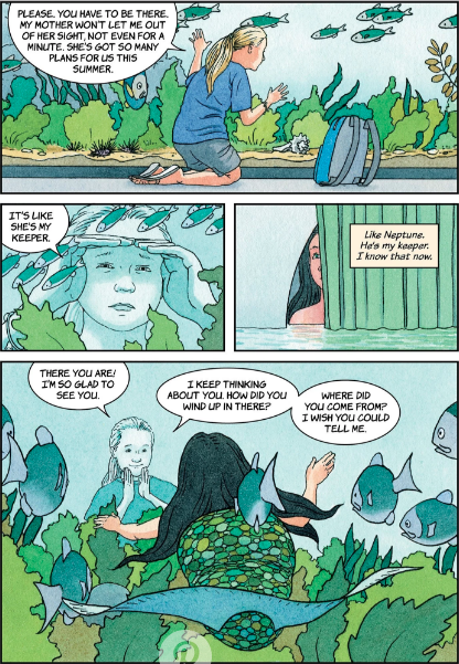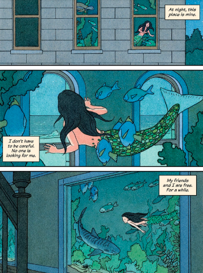 When Livia first sees Fish Girl, she is thrilled to discover she is real and not just a gimmick. Quickly, Livia sees that she and Fish Girl have so much in common and she empathizes with her. Soon, she is returning to Fish Girl's private floor with examples of life on the world outside, like pictures of horses and sandwiches encased in plastic so that silent Fish Girl can learn about life for humans. Livia even gives Fish Girl a name, Mira, short for Miracle. Inspired - knowledge is power - Fish Girl begins exploring outside of her tank.